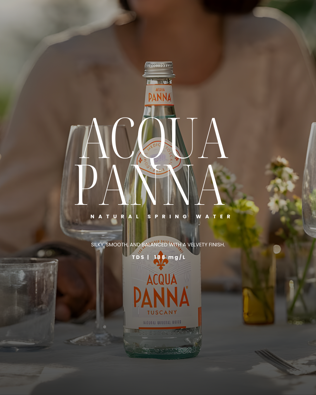Acqua Panna is a Tuscan still mineral water with a silky, velvety taste and balanced mineral profile. Its moderate TDS and alkaline nature make it perfect for fine dining, wine pairing, and elegant hydration, offering more complexity than ultra-light waters but refined enough to complement delicate cuisine.