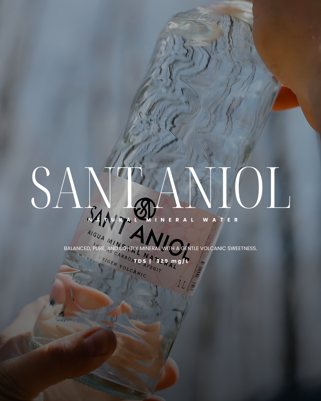 Sant Aniol is a volcanic-origin Spanish mineral water with medium mineralization and a clean, balanced taste. Its purity and gentle sweetness make it ideal for daily hydration and pairing with lighter foods, standing apart from heavier, mineral-rich waters like Contrex or Gerolsteiner.